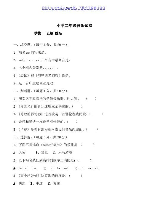 2. 什么是乐谱?它的作用是什么?3. 什么是旋律?它在音乐中的作用是什么?四、听力题(共20分)请听录音,选择合适的答案。