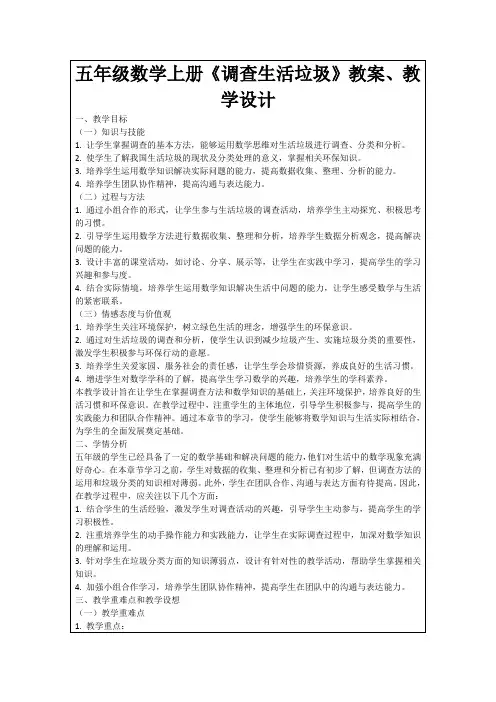三、教学重点与难点1. 教学重点:生活垃圾的分类及处理方法,数学知识在生活垃圾调查中的应用。