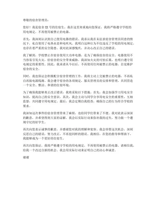 尊敬的宿舍管理员:您好!我是宿舍XX号的住宿生,我在这里郑重地向您保证,我将严格遵守学校的用电规定,不再使用被禁止的电器。