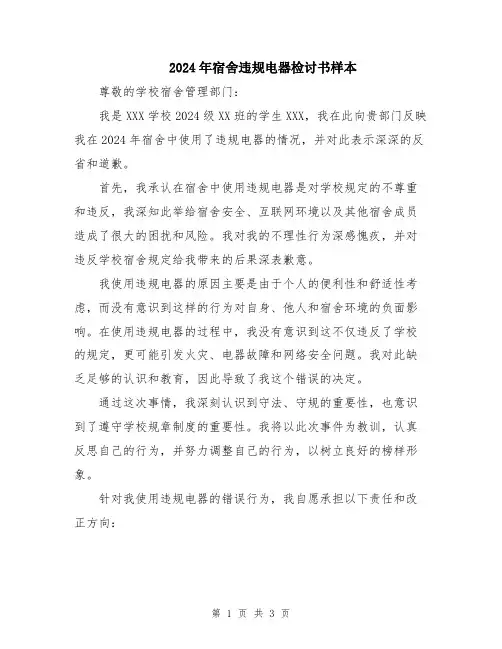 2024年宿舍违规电器检讨书样本尊敬的学校宿舍管理部门:我是XXX学校2024级XX班的学生XXX,我在此向贵部门反映我在2024年宿舍中使用了违规电器的情况,并对此表示深深的反省和道歉。