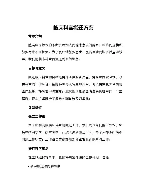 临床科室搬迁方案背景由于医院业务不断增长,为提高服务质量,临床科室需要搬迁至新办公楼。