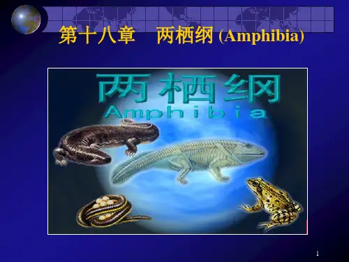 水陆环境的主要差异:(1)含氧量:水:空气(1:20)(2)水密度:比空气大1000倍(3)水温:变幅小25-30(4)陆地环境多样:水生到陆生所面临的问题:(1)呼吸问题(2)支撑身体的问题(3)防止体内水分蒸发的问题(4)在陆地繁殖的问题(5)维持体温的问题(6)感觉器官、神经系统的进化问题适应性特征不完善性1.具五指(趾)型附肢支持力弱,位体侧2.成体为肺呼吸幼体鳃呼吸,皮肤辅助3.皮肤初步角质化角质化不够,怕旱,怕盐4.成体为不完全双循环幼体单循环5.新陈代谢水平低调节能力弱,变温6.体外受精,发育经变态水中繁殖7.神经感官:具中耳,大脑半球分开第二节两栖纲的主要特征本节是本章的重点,要紧紧围绕两栖纲初步适应陆生生活的特征的“初步”二字来学习和掌握。