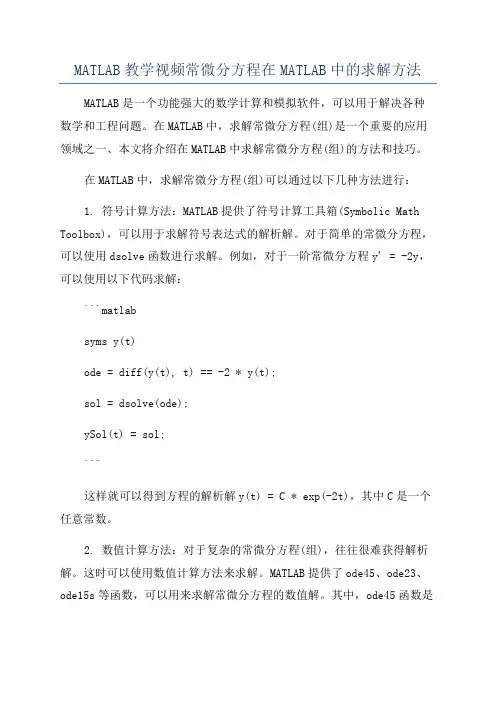 MATLAB教学视频常微分方程在MATLAB中的求解方法MATLAB是一个功能强大的数学计算和模拟软件,可以用于解决各种数学和工程问题。