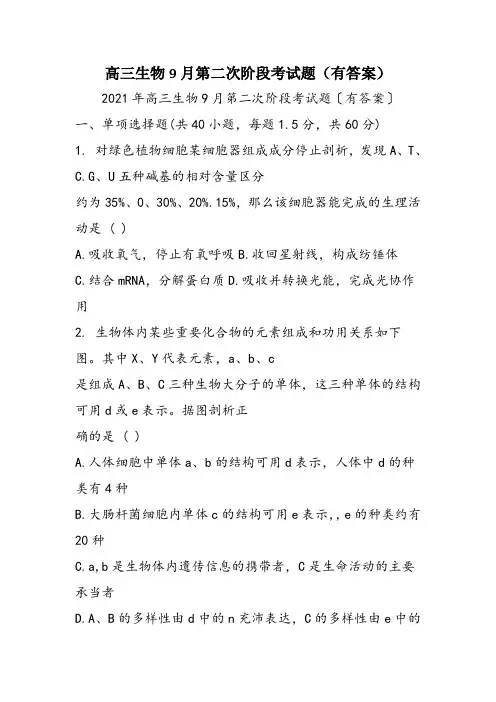 高三生物9月第二次阶段考试题(有答案)2021年高三生物9月第二次阶段考试题〔有答案〕一、单项选择题(共40小题,每题1.5分,共60分)1. 对绿色植物细胞某细胞器组成成分停止剖析,发现A、T、C.G、U五种碱基的相对含量区分约为35%、0、30%、20%.15%,那么该细胞器能完成的生理活动是 ( )A.吸收氧气,停止有氧呼吸B.收回星射线,构成纺锤体C.结合mRNA,分解蛋白质D.吸收并转换光能,完成光协作用2. 生物体内某些重要化合物的元素组成和功用关系如下图。