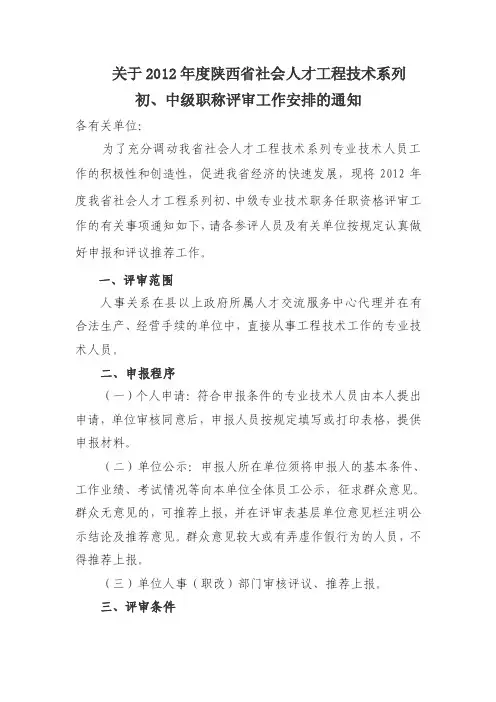 关于2012年度陕西省社会人才工程技术系列初、中级职称评审工作安排的通知各有关单位:为了充分调动我省社会人才工程技术系列专业技术人员工作的积极性和创造性,促进我省经济的快速发展,现将2012年度我省社会人才工程系列初、中级专业技术职务任职资格评审工作的有关事项通知如下,请各参评人员及有关单位按规定认真做好申报和评议推荐工作。