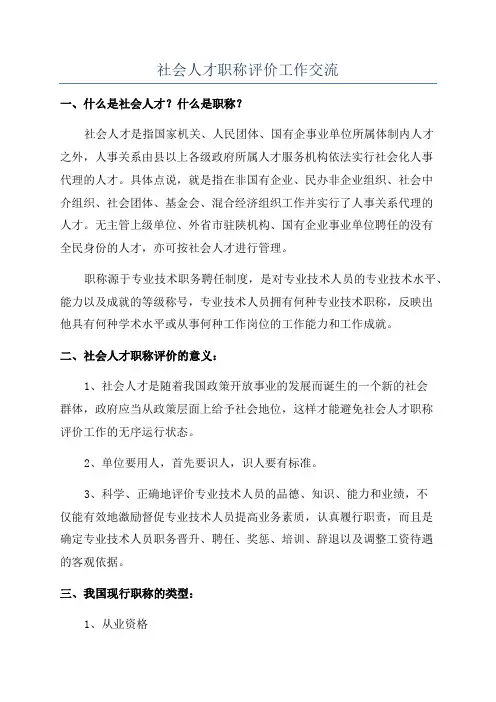 社会人才职称评价工作交流一、什么是社会人才?什么是职称?社会人才是指国家机关、人民团体、国有企事业单位所属体制内人才之外,人事关系由县以上各级政府所属人才服务机构依法实行社会化人事代理的人才。