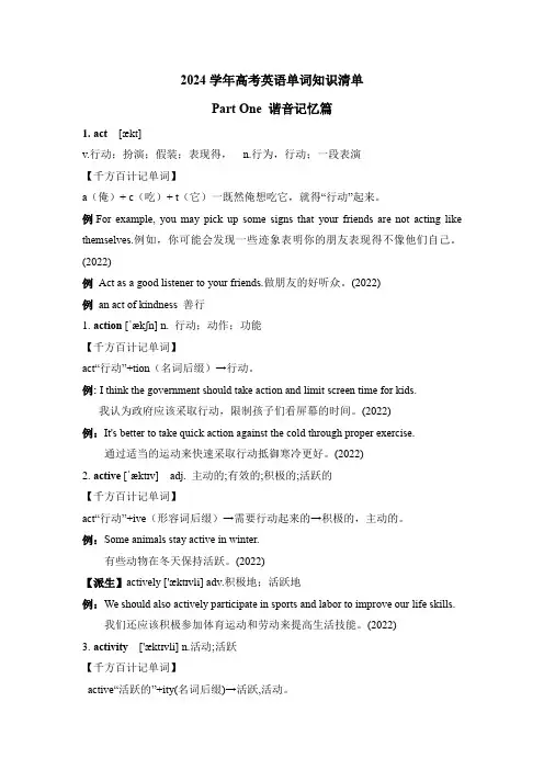2024学年高考英语单词知识清单Part One 谐音记忆篇1.act [ækt]v.行动;扮演;假装;表现得,n.行为,行动;一段表演【千方百计记单词】a(俺)+ c(吃)+ t(它)一既然俺想吃它,就得“行动”起来。