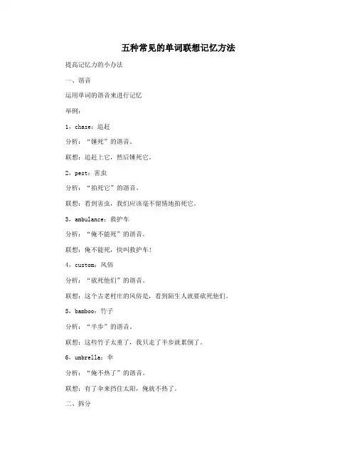 五种常见的单词联想记忆方法提高记忆力的小办法一、谐音运用单词的谐音来进行记忆举例:1,chase:追赶分析:“锤死”的谐音。