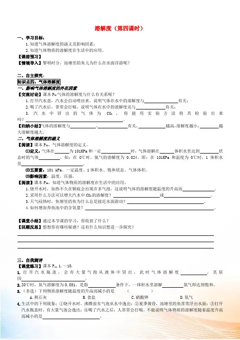 溶解度(第四课时)一、学习目标:1.知道气体溶解度的涵义及影响因素;2.知道气体物质的溶解度在生活中的应用。