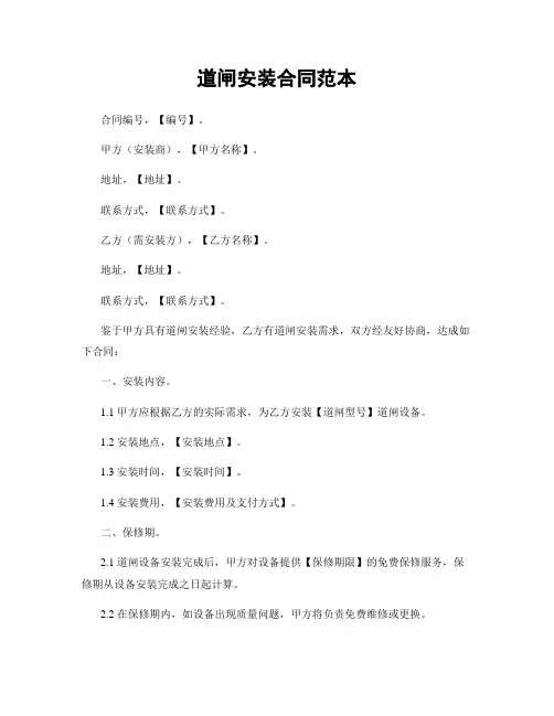 三、保修期及售后服务3.1 道闸安装完成后,乙方应为甲方提供一年的免费保修期,对道闸进行定期检查和维护,保证道闸的正常使用。