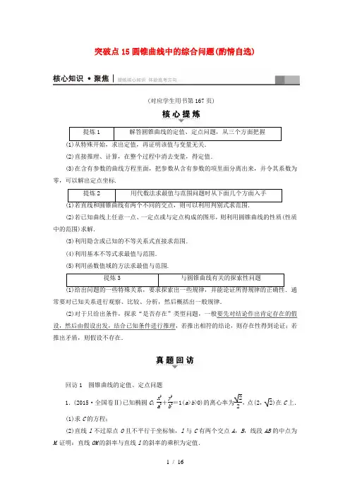 突破点15圆锥曲线中的综合问题(酌情自选)(对应学生用书第167页)提炼1解答圆锥曲线的定值、定点问题,从三个方面把握(2)直接推理、计算,在整个过程中消去变量,得定值.(3)在含有参数的曲线方程里面,把参数从含有参数的项里面分离出来,并令其系数为零,可以解出定点坐标.提炼2用代数法求最值与范围问题时从下面几个方面入手(2)若已知曲线上任意一点、一定点或与定点构成的图形,则利用圆锥曲线的性质(性质中的范围)求解.(3)利用隐含或已知的不等关系式直接求范围. (4)利用基本不等式求最值与范围. (5)利用函数值域的方法求最值与范围.提炼3与圆锥曲线有关的探索性问题常要对已知关系进行观察、比较、分析,然后概括出一般规律.(2)对于只给出条件,探求“是否存在”类型问题,一般要先对结论作出肯定存在的假设,然后由假设出发,结合已知条件进行推理,若推出相符的结论,则存在性得到论证;若推出矛盾,则假设不存在.回访1 圆锥曲线的定值、定点问题1.(2015·全国卷Ⅱ)已知椭圆C :x 2a 2+y 2b 2=1(a >b >0)的离心率为22,点(2,2)在C 上.(1)求C 的方程;(2)直线l 不过原点O 且不平行于坐标轴,l 与C 有两个交点A ,B ,线段AB 的中点为M .证明:直线OM 的斜率与直线l 的斜率的乘积为定值.[解] (1)由题意有a 2-b 2a =22,4a 2+2b2=1,2分解得a 2=8,b 2=4.3分 所以C 的方程为x 28+y 24=1.4分 (2)证明:设直线l :y =kx +b (k ≠0,b ≠0),A (x 1,y 1),B (x 2,y 2),M (x M ,y M ). 将y =kx +b 代入x 28+y 24=1,得(2k 2+1)x 2+4kbx +2b 2-8=0.6分 故x M =x 1+x 22=-2kb 2k 2+1,y M =k ·x M +b =b2k 2+1.8分 于是直线OM 的斜率k OM =y M x M =-12k,即k OM ·k =-12.11分所以直线OM 的斜率与直线l 的斜率的乘积为定值.12分 回访2 圆锥曲线中的最值与范围问题2.(2016·山东高考)已知椭圆C :x 2a 2+y 2b2=1(a >b >0)的长轴长为4,焦距为2 2.(1)求椭圆C 的方程.(2)过动点M (0,m )(m >0)的直线交x 轴于点N ,交C 于点A ,P (P 在第一象限),且M 是线段PN 的中点.过点P 作x 轴的垂线交C 于另一点Q ,延长QM 交C 于点B .①设直线PM ,QM 的斜率分别为k ,k ′,证明k ′k为定值; ②求直线AB 的斜率的最小值.图151[解] (1)设椭圆的半焦距为c .由题意知2a =4,2c =22,所以a =2,b =a 2-c 2= 2. 所以椭圆C 的方程为x 24+y 22=1.2分(2)①证明:设P (x 0,y 0)(x 0>0,y 0>0). 由M (0,m ),可得P (x 0,2m ),Q (x 0,-2m ).3分所以直线PM 的斜率k =2m -m x 0=mx 0,4分直线QM 的斜率k ′=-2m -m x 0=-3m x 0.5分此时k ′k =-3.所以k ′k为定值-3.6分 ②设A (x 1,y 1),B (x 2,y 2).由①知直线PA 的方程为y =kx +m ,则直线QB 的方程为y =-3kx +m .联立⎩⎪⎨⎪⎧y =kx +m ,x 24+y22=1,整理得(2k 2+1)x 2+4mkx +2m 2-4=0.8分 由x 0x 1=2m 2-42k 2+1,可得x 1=2m 2-22k 2+1x 0, 所以y 1=kx 1+m =2k m 2-22k 2+1x 0+m .9分 同理x 2=2m 2-218k 2+1x 0,y 2=-6k m 2-218k 2+1x 0+m .10分 所以x 2-x 1=2m 2-218k 2+1x 0-2m 2-22k 2+1x 0=-32k2m 2-218k 2+12k 2+1x 0,11分 y 2-y 1=-6k m 2-218k 2+1x 0+m -2k m 2-22k 2+1x 0-m =-8k 6k 2+1m 2-218k 2+12k 2+1x 0,12分 所以k AB =y 2-y 1x 2-x 1=6k 2+14k =14⎝ ⎛⎭⎪⎫6k +1k .由m >0,x 0>0,可知k >0,所以6k +1k ≥26,等号当且仅当k =66时取得.此时m4-8m2=66,即m =147,符合题意. 所以直线AB 的斜率的最小值为62.14分 回访3 与圆锥曲线有关的探索性问题3.(2015·四川高考)如图152,椭圆E :x 2a 2+y 2b 2=1(a >b >0)的离心率是22,点P (0,1)在短轴CD 上,且PC →·PD →=-1.(1)求椭圆E 的方程;(2)设O 为坐标原点,过点P 的动直线与椭圆交于A ,B 两点.是否存在常数λ,使得OA →·OB →+λPA →·PB →为定值?若存在,求λ的值;若不存在,请说明理由.图152[解] (1)由已知,点C ,D 的坐标分别为(0,-b ),(0,b ). 又点P 的坐标为(0,1),且PC →·PD →=-1,于是⎩⎪⎨⎪⎧1-b 2=-1,c a =22,a 2-b 2=c 2.解得a =2,b = 2.所以椭圆E 的方程为x 24+y 22=1.4分(2)当直线AB 的斜率存在时,设直线AB 的方程为y =kx +1,A ,B 的坐标分别为(x 1,y 1),(x 2,y 2).联立⎩⎪⎨⎪⎧x 24+y 22=1,y =kx +1,得(2k 2+1)x 2+4kx -2=0.其判别式Δ=(4k )2+8(2k 2+1)>0, 所以x 1+x 2=-4k 2k 2+1,x 1x 2=-22k 2+1.6分 从而,OA →·OB →+λPA →·PB →=x 1x 2+y 1y 2+λ[x 1x 2+(y 1-1)(y 2-1)] =(1+λ)(1+k 2)x 1x 2+k (x 1+x 2)+1 =-2λ-4k 2+-2λ-12k 2+1=-λ-12k 2+1-λ-2.9分所以,当λ=1时,-λ-12k 2+1-λ-2=-3.此时,OA →·OB →+λPA →·PB →=-3为定值.10分 当直线AB 斜率不存在时,直线AB 即为直线CD .此时,OA →·OB →+λPA →·PB →=OC →·OD →+PC →·PD →=-2-1=-3.12分 故存在常数λ=1,使得OA →·OB →+λPA →·PB →为定值-3.13分(对应学生用书第167页)热点题型1 圆锥曲线中的定值问题题型分析:圆锥曲线中的定值问题是近几年高考的热点内容,解决这类问题的关键是引入变化的参数表示直线方程、数量积、比例关系等,根据等式恒成立,数式变换等寻找不受参数影响的量.(2016·烟台二模)已知椭圆C :x 2a 2+y 2b 2=1(a >b >0)的左焦点F 1与抛物线y 2=-43x 的焦点重合,过点F 1的直线l 交椭圆于A ,B 两点.当直线l 经过椭圆C 的一个短轴端点时,与以原点O 为圆心,以椭圆的离心率e 为半径的圆相切.(1)求椭圆C 的方程;(2)是否在x 轴上存在定点M ,使AM →·BM →为定值?若存在,请求出定点M 及定值;若不存在,请说明理由.[解] (1)依题意,得c =3,即F 1(-3,0).1分 又由题意可得e =bc a =c a,所以b =1,2分 所以a =2,3分所以所求椭圆C 的方程为x 24+y 2=1.4分(2)当直线l 的斜率存在时,则可设直线l 的方程为y =k (x +3),联立⎩⎪⎨⎪⎧y =k x +3,x 24+y 2=1,消去y 得(4k 2+1)x 2+83k 2x +12k 2-4=0.设A (x 1,y 1),B (x 2,y 2),则由韦达定理可得x 1+x 2=-83k 24k 2+1,x 1x 2=12k 2-44k 2+1.7分设点M (m,0),则AM →=(m -x 1,-y 1),BM →=(m -x 2,-y 2), AM →·BM →=(m -x 1)(m -x 2)
