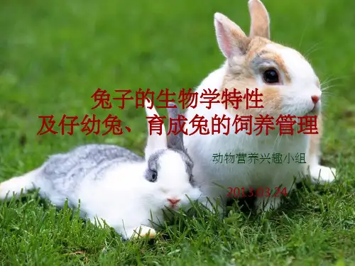 三、兔子健康管理1. 预防疾病:兔子疫病防治工作是兔子健康管理的重要内容,应定期为兔子进行疫苗接种和驱虫,保证兔子不受疫病侵扰。