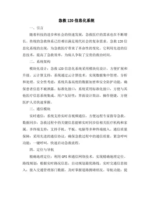 三、系统功能1. 快速响应急救120信息化系统可以实时接收急救呼叫,并自动派遣最近的急救车辆前往现场,大大缩短了急救响应时间,提高了救治效果。