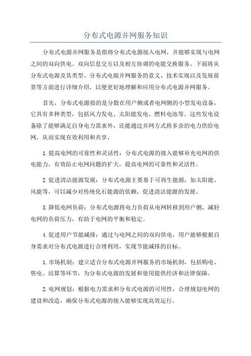 分布式电源并网服务知识分布式电源并网服务是指将分布式电源接入电网,并能够实现与电网之间的双向供电、双向信息交互以及相互协调的电能交换服务。