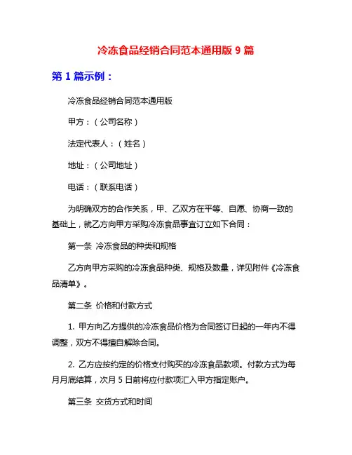 冷冻食品经销合同范本通用版9篇第1篇示例:冷冻食品经销合同范本通用版甲方:(公司名称)法定代表人:(姓名)地址:(公司地址)电话:(联系电话)为明确双方的合作关系,甲、乙双方在平等、自愿、协商一致的基础上,就乙方向甲方采购冷冻食品事宜订立如下合同:第一条冷冻食品的种类和规格乙方向甲方采购的冷冻食品种类、规格及数量,详见附件《冷冻食品清单》。