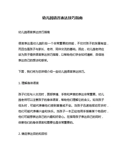 幼儿园教师的语言表达技巧幼儿园教师的语言表达技巧作为幼儿园教师,在与幼儿交流时合适的语言表达方式尤为重要。