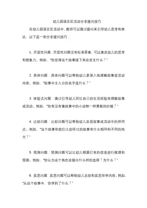 在幼儿园语言区活动中,教师可以通过提问来引导幼儿思考和表达,以下是一些分享提问技巧: