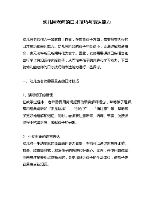 一、语言表达技巧语言表达技巧是幼儿园老师必须具备的基本能力。