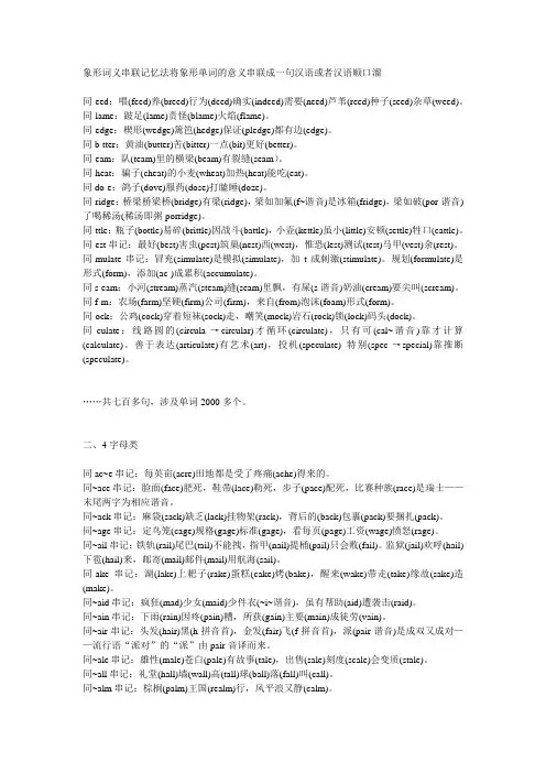 象形词义串联记忆法将象形单词的意义串联成一句汉语或者汉语顺口溜同-eed:喂(feed)养(breed)行为(deed)确实(indeed)需要(need)芦苇(reed)种子(seed)杂草(weed)。