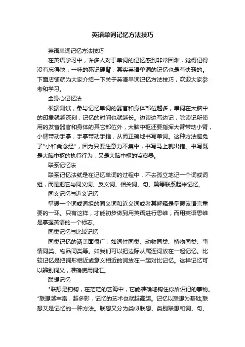 英语单词记忆方法技巧英语单词记忆方法技巧在英语学习中,许多人对于单词的记忆感到非常困难,觉得记得没有忘得快,一味的死记硬背,其实英语单词的记忆也是有诀窍的。