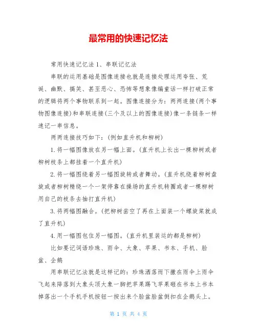 最常用的快速记忆法常用快速记忆法1、串联记忆法串联的运用基础是图像连接也就是连接处理运用夸张、荒诞、幽默、搞笑、甚至恶心、恐怖等想象像编童话一样打破正常的逻辑将两个事物联系到一起。