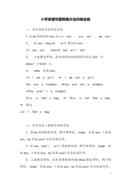 小学英语句型转换方法+口诀大全1、肯定句改否定句的方法:1.在be动词后加not如:is not, are not,am not2.在can,should,will等后加not如:cannot, should not,will not;3.上述都没有的,在动词前加助动词否定形式don't/doesn't/didn't4、some 改成any如:I am a girl. →I am not a girl.You are a student. →You are not a student.→You aren’t a student.This is Tom’s bag, →This is not Tom’s bag.→This isn’t Tom’s bag.2、肯定句改一般疑问句的方法1.把be动词放在句首,剩下的照抄(some 改成any,I改成you,my改成your)句点改成问号。