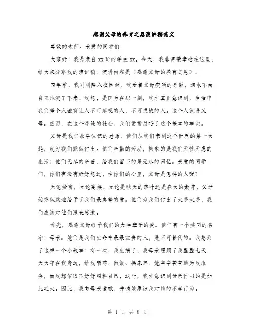 感谢父母的养育之恩演讲稿感谢父母的养育之恩演讲稿精选4篇(一)尊敬的各位领导、老师、亲爱的同学们:大家上午好!我演讲的题目是《感谢父母的养育之恩》。