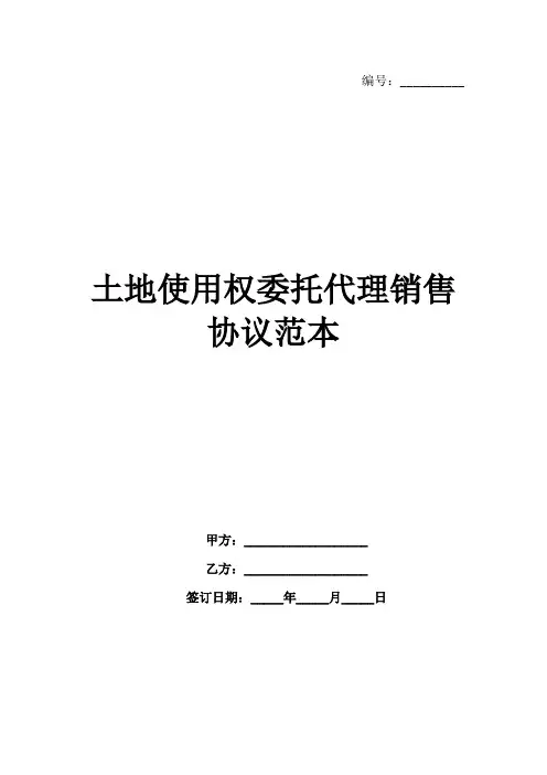 编号:__________土地使用权委托代理销售协议范本甲方:___________________乙方:___________________签订日期:_____年_____月_____日土地使用权委托代理销售协议范本合同编号_________一、合同主体甲方(委托方):名称:____________________地址:____________________联系人:__________________联系电话:________________乙方(代理方):名称:____________________地址:____________________联系人:__________________联系电话:________________二、合同前言2.1 背景和目的鉴于甲方拥有土地使用权,并有意委托乙方代理销售;鉴于乙方在土地使用权销售领域具有丰富的经验和资源,双方本着平等、自愿、诚实信用的原则,就甲方土地使用权委托代理销售事宜,达成如下协议。