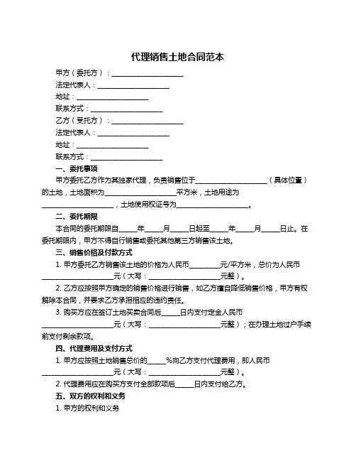 代理销售土地合同范本甲方(委托方):________________乙方(代理方):________________鉴于甲方拥有位于_______(土地所在地)的土地一块,土地面积为_______平方米,土地性质为_______(住宅、商业、工业等),并愿意出售该土地;鉴于乙方是一家专业的房地产代理公司,愿意接受甲方的委托,代理销售上述土地;双方本着平等互利的原则,经友好协商,就甲方委托乙方代理销售土地事宜,达成如下合同:第一条代理销售权1.1 甲方授权乙方为该土地的独家代理销售方,乙方有权在合同有效期内,代表甲方进行该土地的销售活动。