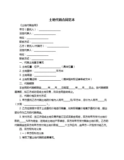 土地代销合同范本甲方(委托方):_______________________法定代表人:_______________________地址:_______________________联系方式:_______________________乙方(受托方):_______________________法定代表人:_______________________地址:_______________________联系方式:_______________________一、委托代销土地基本情况1. 土地位置:位于_______________________(具体位置)2. 土地面积:_______________________平方米3. 土地用途:_______________________4. 土地权属证明:_______________________(提供相关权证编号)二、委托代销期限本合同委托代销期限自______年____月____日起至______年____月____日止。