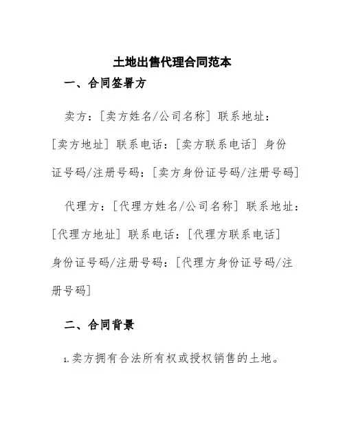 土地出售代理合同范本一、合同签署方卖方:[卖方姓名/公司名称] 联系地址:[卖方地址] 联系电话:[卖方联系电话] 身份证号码/注册号码:[卖方身份证号码/注册号码]代理方:[代理方姓名/公司名称] 联系地址:[代理方地址] 联系电话:[代理方联系电话]身份证号码/注册号码:[代理方身份证号码/注册号码]二、合同背景1.卖方拥有合法所有权或授权销售的土地。