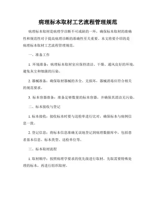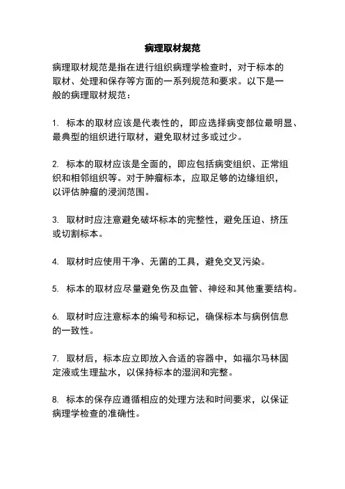 病理取材规范病理取材规范是指在进行组织学检查时,医务人员需要按照一定的规范操作,以保证病理检查结果的准确性和可靠性。