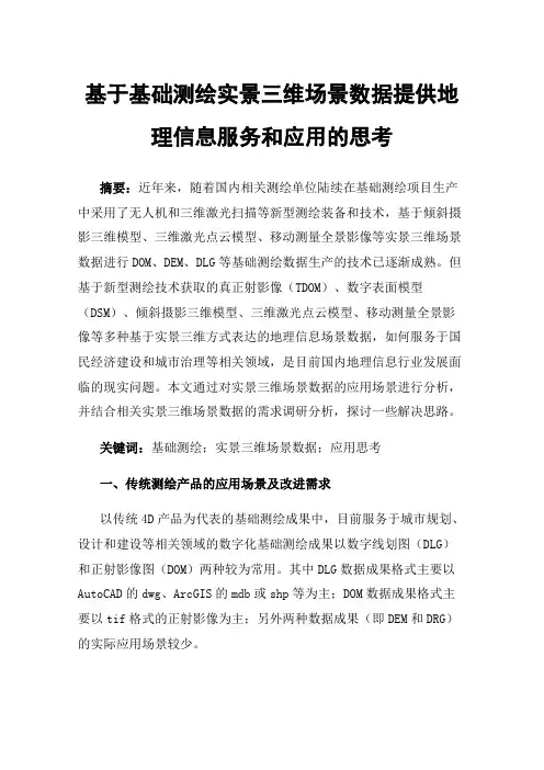 关键词:基础测绘;实景三维场景数据;应用思考一、传统测绘产品的应用场景及改进需求以传统4D产品为代表的基础测绘成果中,目前服务于城市规划、设计和建设等相关领域的数字化基础测绘成果以数字线划图(DLG)和正射影像图(DOM)两种较为常用。