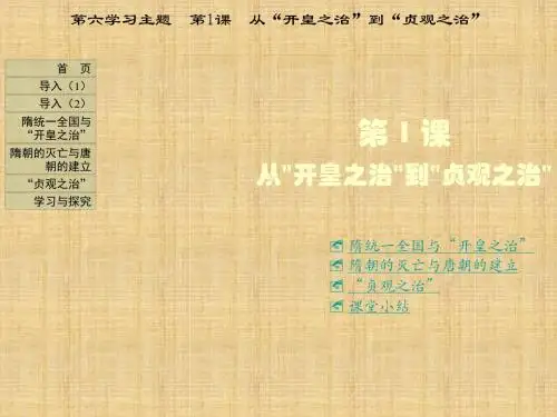 从“开皇之治”到“贞观之治”教案章节:一、开皇之治【教学目标】1. 了解隋文帝杨坚统一中国后,实行的一系列政治、经济改革措施。