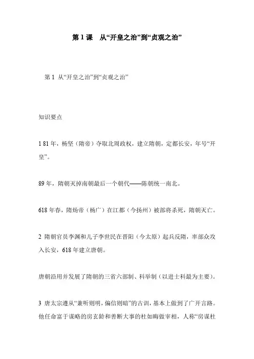 第1课从“开皇之治”到“贞观之治”第1 从“开皇之治”到“贞观之治”知识要点1 81年,杨坚(隋帝)夺取北周政权,建立隋朝,定都长安,年号“开皇”。