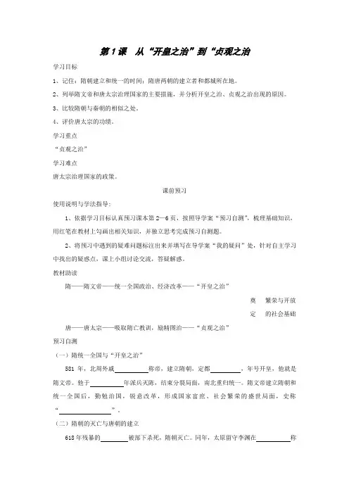 课题第1课从“开皇之治”到“贞观之治”课型新授第 1 课时教学目标1、、记住隋统一时间,唐太宗的姓名和年号,隋唐两朝的都城,了解“贞观之治”的主要内容,理解“贞观之治”形成的原因。