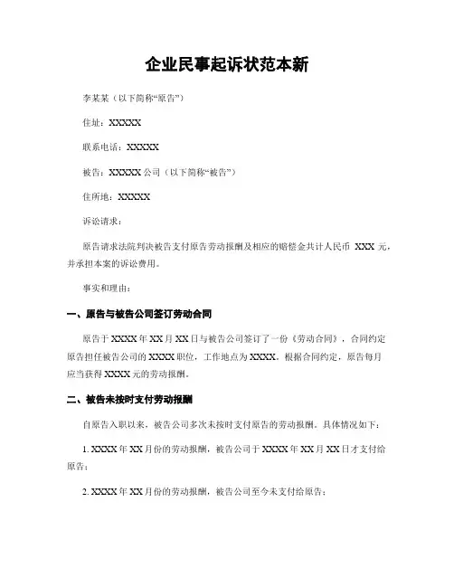 企业民事起诉状范本新李某某(以下简称“原告”)住址:XXXXX联系电话:XXXXX被告:XXXXX公司(以下简称“被告”)住所地:XXXXX诉讼请求:原告请求法院判决被告支付原告劳动报酬及相应的赔偿金共计人民币XXX元,并承担本案的诉讼费用。