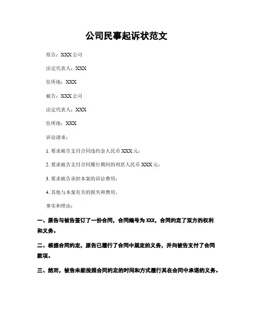 公司民事起诉状范文原告:XXX公司法定代表人:XXX住所地:XXX被告:XXX公司法定代表人:XXX住所地:XXX诉讼请求:1. 要求被告支付合同违约金人民币XXX元;2. 要求被告支付合同履行期间的利息人民币XXX元;3. 要求被告承担本案的诉讼费用;4. 其他与本案有关的损失和费用。