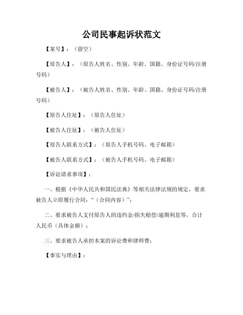 公司民事起诉状范文【案号】:(留空)【原告人】:(原告人姓名、性别、年龄、国籍、身份证号码/注册号码)【被告人】:(被告人姓名、性别、年龄、国籍、身份证号码/注册号码)【原告人住址】:(原告人住址)【被告人住址】:(被告人住址)【原告人联系方式】:(原告人手机号码、电子邮箱)【被告人联系方式】:(被告人手机号码、电子邮箱)【诉讼请求事项】:一、根据《中华人民共和国民法典》等相关法律法规的规定,要求被告人立即履行合同:“(合同内容)”;二、要求被告人支付原告人的违约金/损失赔偿/逾期利息等,合计人民币(具体金额);三、要求被告人承担本案的诉讼费和律师费;【事实与理由】:一、(详细描述事实经过,包括但不限于合同成立经过、履行情况、违约行为等。