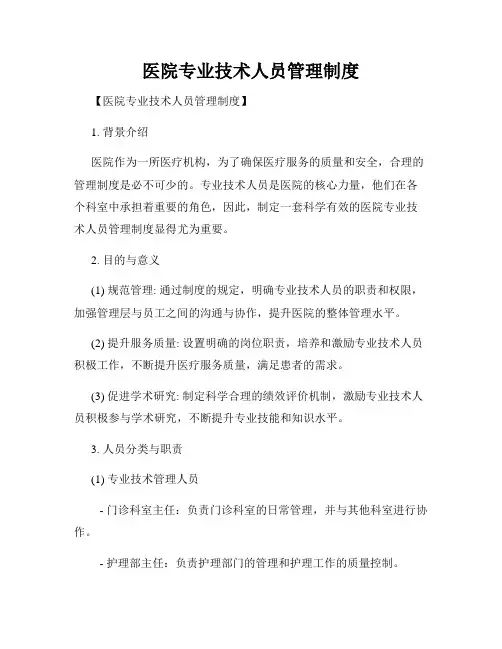 第一章总则第一条为加强医院专业技术人员管理,提高医疗质量和服务水平,保障医疗安全,根据《中华人民共和国医疗机构管理条例》及相关法律法规,结合我院实际情况,制定本制度。