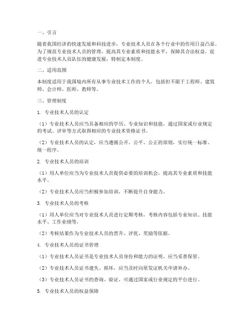 第一章总则第一条为加强公司技术专业人员的管理,提高技术人员的专业素质和团队协作能力,确保公司技术工作的顺利进行,特制定本制度。