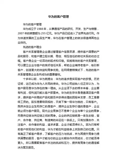 华为的客户管理华为的客户管理华为成立于1988年,从事通信产品的研究、开发、生产与销售,2007年的销售额为255亿元。