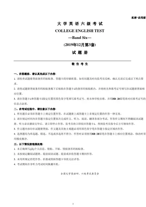 机密*启用前大学英语六级考试COLLEGE ENGLISH TEST—Band Six—(2019年12月第3套)试题册敬告考生一、在答题前,请认真完成以下内容:1. 请检查试题册背面条形码粘贴条、答题卡的印刷质量,如有问题及时向监考员反映,确认无误后完成以下两点要求。