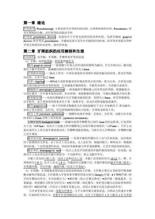 第一章绪论1.牙周病学(periodontology):口腔医学中一门独立的专门学科(specialty),主要研究牙周组织的结构、生理、和病理变化。