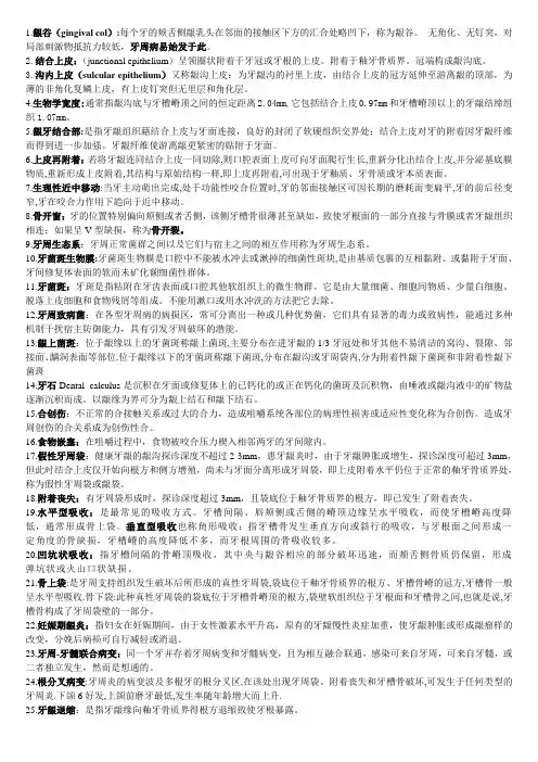 考点4 牙菌斑生物膜分类1.龈上菌斑的形态特点(了解)①龈缘以上的菌斑;②G+,兼性厌氧菌优势(G->G+,厌氧菌>兼性厌氧菌>需氧菌);2.龈下菌斑-附着性菌斑,非附着性菌斑附着性菌斑:位于龈缘以下,由龈上菌斑延伸到牙周袋内形成,所以成分和组成,与龈上菌斑相似;考点5 非附着性菌斑性质和特点①结构松散的菌群,显游离状态;②G-专性厌氧菌X力强;③与牙槽骨的快速破坏有关,与侵袭性、游离状态??牙周炎的发生发展密切相关;④被认为是牙周炎的“进展前沿”;⑤Aa伴放线放线杆菌;考点6 各型牙周病有关的致病菌表格 P162考点7 牙周病的致病菌表格 P163考点8 局部促进因素有哪些(只记标题)考点9(1)牙石①已钙化的或正在钙化的菌斑及沉积物;②龈上结石:体积较大,疏松多孔,乳白色,唾液矿化,唾石;龈下结石:体积小而硬,褐色或黑色,龈沟液矿化,血石;③牙结石不能直接导致牙龈炎和牙周炎;④机械压迫可导致龈乳头炎;⑤牙石的多孔结构也容易吸收大量的细菌毒素;(2)解剖因素;(3)牙齿位置异常;(4)其他诱病因素;考点10(5)合创伤(分为原发性和继发性;弄清区别)合创伤可分为:原发性合创伤,继发性合创伤;原发性和继发性合创伤并存;造成合创伤的因素:原发性:咬合力异常;继发性:牙周支持力不足,此时已有牙周炎;考点11 食物嵌塞的类型和原因①水平型食物嵌塞:老年人牙龈萎缩,舌侧外展隙过大;②垂直型食物嵌塞:邻接点破坏;缺牙未及时修复;充填式牙尖;△不良习惯(了解)P164;牙面着色(了解)P164考点12 牙周病全身促进因素宿主反应(1)遗传因素;(2)性激素;①牙龈是一些性激素的靶器官;②牙菌斑的存在是性激素发挥作用的前提;(3)吸烟;既是全身因素,又是局部因素;牙槽骨的吸收程度与吸烟量有关;(4)有关的系统性疾病;糖尿病与牙周病是相互促进,相互恶化;精神压力:精神压力与牙周病的关系见于急性坏死性溃疡性龈炎(ANUG),也称战壕口,与经济拮据有关的精神压力是成人牙周炎的明显危险指征。