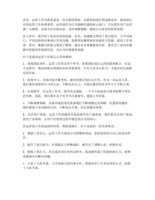 在运营工作中,我还体会到了以下几方面:1. 持续优化:运营工作是一个不断优化的过程。