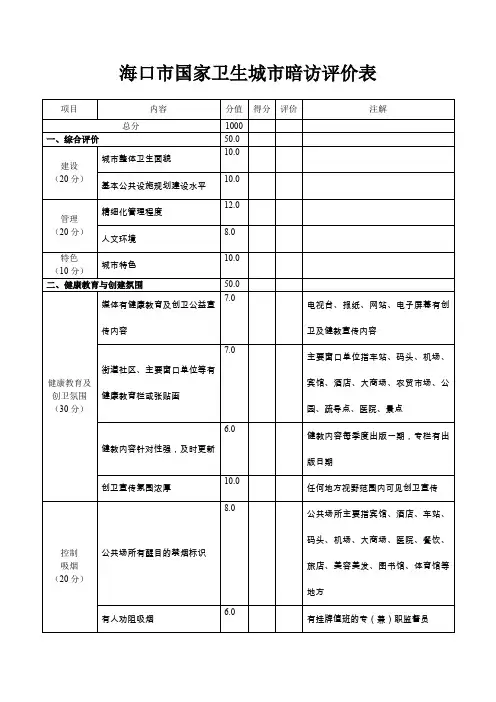 国家卫生城市现场评估量化评价记分表一、前言国家卫生城市现场评估量化评价记分表,作为评估城市卫生状况的重要工具,对城市卫生城市建设和管理具有重要的指导意义。
