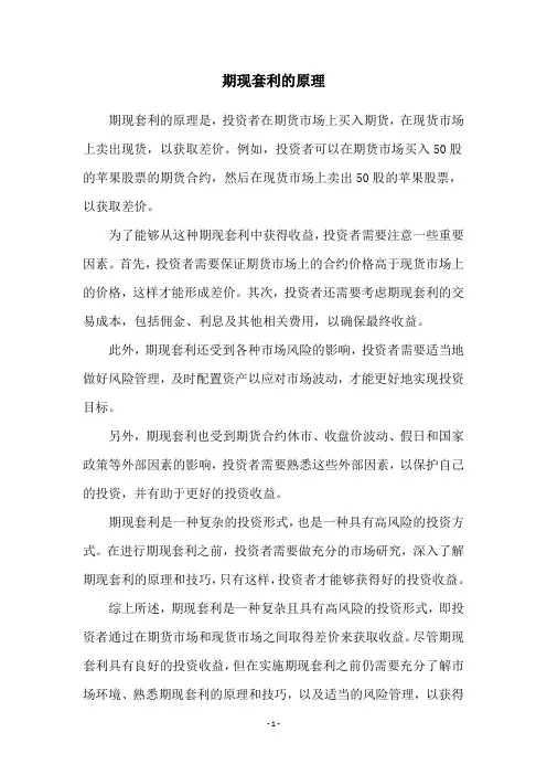 3. 注意事项在进行期现套利时,需要注意以下事项:•了解市场风险:期现套利涉及两个市场,需要充分了解市场的风险特点,做好风险管理工作。
