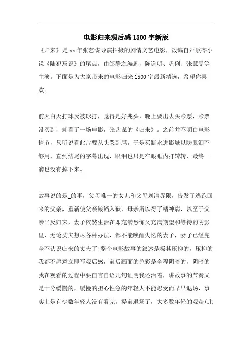 电影归来观后感1500字新版《归来》是xx年张艺谋导演拍摄的剧情文艺电影,改编自严歌苓小说《陆犯焉识》的尾点,由邹静之编剧,陈道明、巩俐、张慧雯等主演。