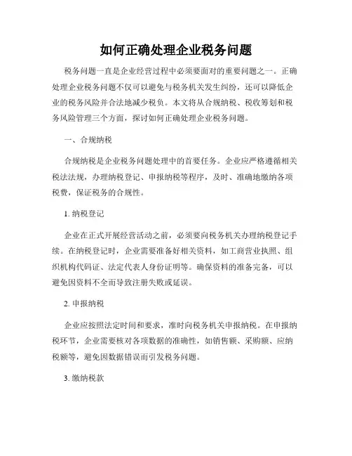一、企业税务风险的规避1. 合理遵守税法企业应当建立健全的税务管理制度,确保遵守税法的规定。